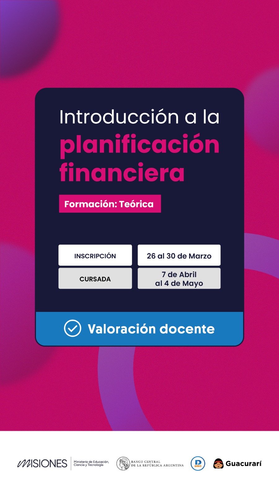 Esta propuesta tiene como objetivo acercar a docentes herramientas concretas para comprender y utilizar de manera adecuada los servicios financieros disponibles, promoviendo una formación práctica y contextualizada. Asimismo, los docentes de nivel secundario contarán con certificación con valoración docente, reconociendo su participación y compromiso en la propuesta formativa.